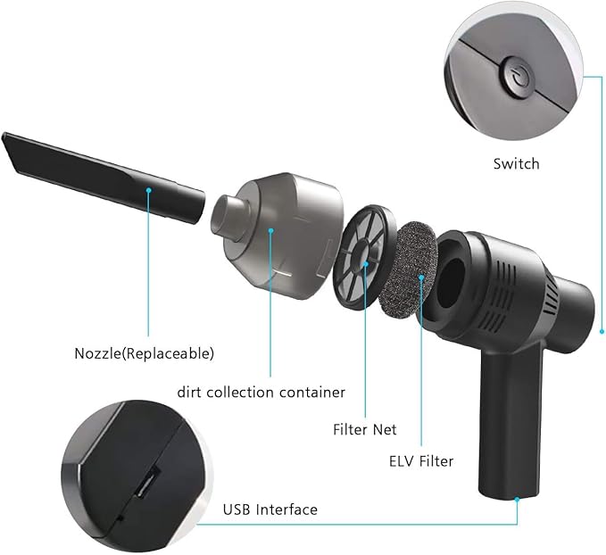 - Instructions for use:Power switch,long press to power on,short press to power off;Long standby time:The computer vacuum cleaner dust cleaner run nearly work up to 50 minutes after full charge and the suction will be more.