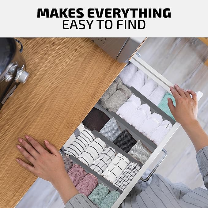 - EASY & SECURE INSTALLATION: Quickly install these gray dividers without the need for tools. The strong, spring-loaded mechanism ensures they remain firmly in place, even with daily use. Additionally, the EVA foam at each end prevents slipping and protects your drawers from scratches or pressure damage, ensuring both stability and safety.