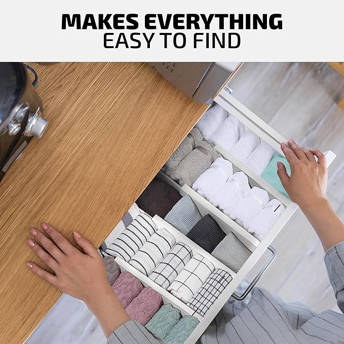 - EASY & SECURE INSTALLATION: Quickly install these dividers without the need for tools. The strong, spring-loaded mechanism ensures they remain firmly in place, even with daily use. Additionally, the EVA foam at each end prevents slipping and protects your drawers from scratches or pressure damage, ensuring both stability and safety.