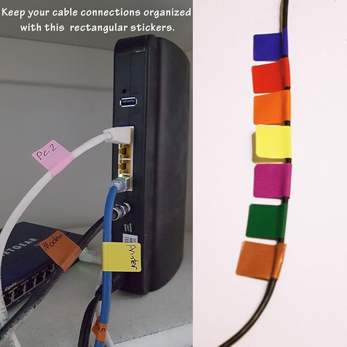 - The rectangular sticker adheres firmly to papers, cards, notebooks, foam boards, bins, shelves, boxes and etc. Colorful rectangle stickers can be used as kids name tag stickers. Great for organizing your group of cables for easy identification and keeping your space tidy.