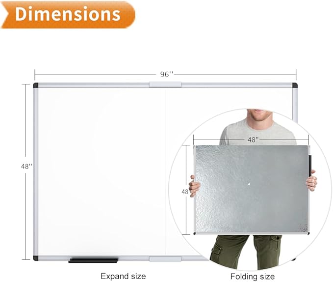 - [High Quality Details] Smooth & durable magnetic writing surface, easily dry wipe with all dry-erase markers. Folding design ensures that the whiteboard will not warp in transit. Anti-Scratch silver finished aluminium frame, ABS plastic corner with screw-fixing in corners, Detachable Marker Tray.