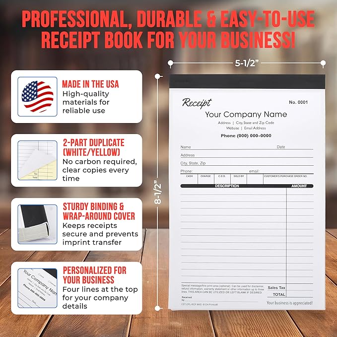 Custom Duplicate Receipt Books with Your Company Name. 2 Books (100 Sets) Numbered.