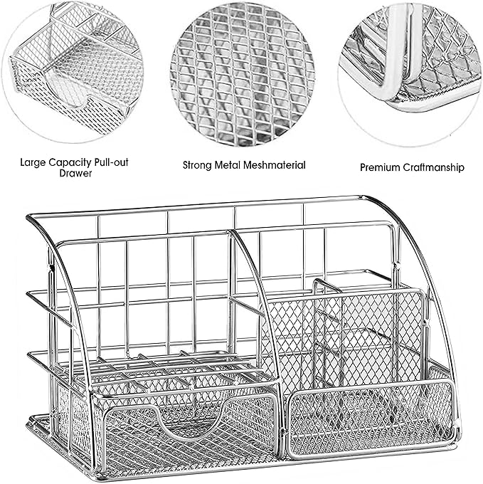 - 【Elegant Desk Organizers】Our cute and stylish desktop organizer features 5 separate compartments and 1 mini sliding drawer. The desktop organizer is adopting with a powder coat finish and electroplating technology ,wear-resistant, anti-oxidation, and long lasting and does not fade . The rounded corners metal rim and trim add to the visual appeal, and protect your desk.