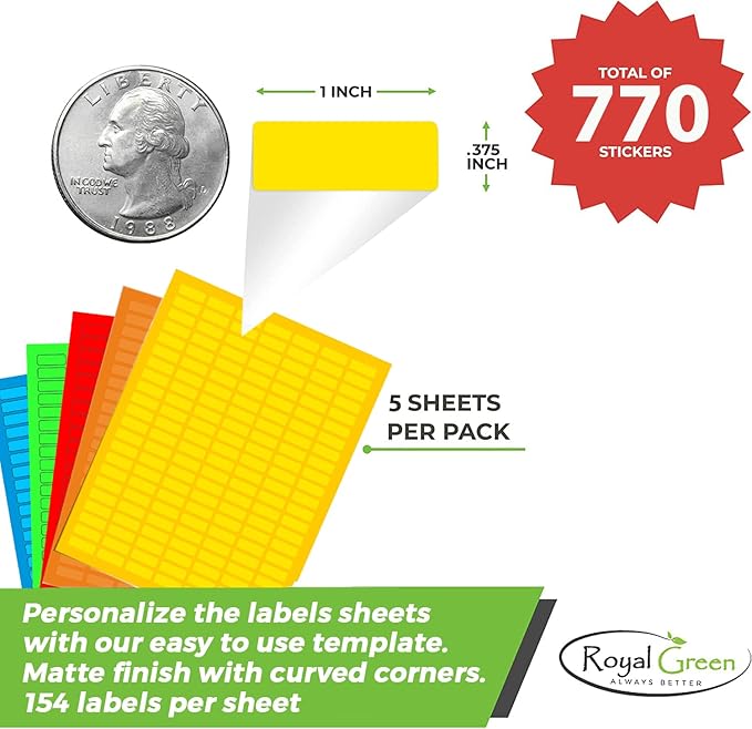 Small Matte Printing Labels for Printer Laser/Inkjet 1 inch x 0.375 inch Neon Sticker Sheets with Template Included - 770 Pack
