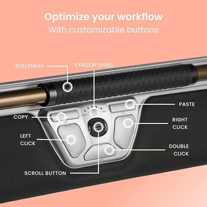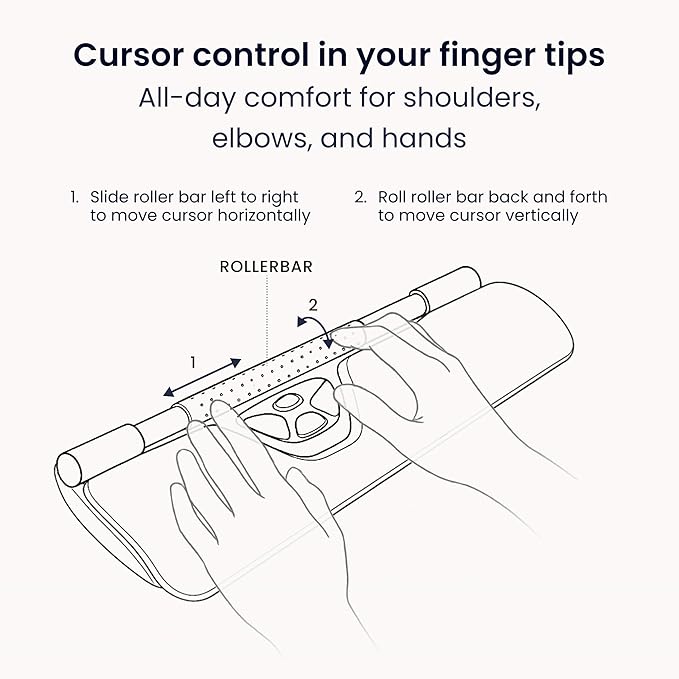 - ✅ NO GRIPPING, LESS FATIGUE: The patented Rollerbar enables relaxed cursor control with fingers. You can slide the Rollerbar left and right, roll it up and down to move the cursor, and tap for single and double clicks. This removes the need to reach for, grip, or move a traditional mouse by hand; significantly reducing tension in your neck, shoulders, arms, and wrists compared to both standard and vertical ergonomic mice.