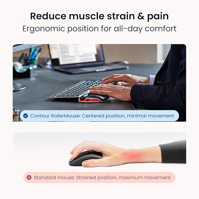 - ✅ CONTOUR ROLLERMOUSE RED - ERGONOMIC, CENTRALIZED DESIGN: Rollermouse Red sits directly beneath your keyboard to eliminate reaching for a mouse. This centralized position helps keep your hands within shoulder width, reducing strain on your neck, shoulders, forearms and wrists relief. ✅ Wireless ✅ Regular