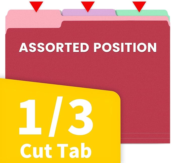- 1/3 Cut Tab:Navigate your documents with ease using the 1/3 cut file folder labels on these manila folders. This convenient design allows for clear and easy labeling, streamlining the organization and retrieval of your files. Keep your office clutter-free with these colored file folders.