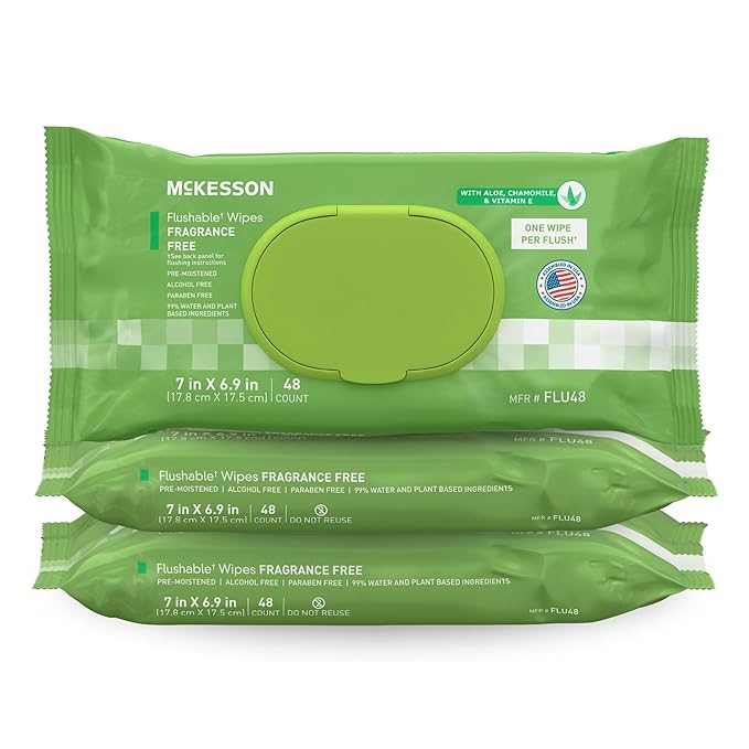 McKesson Adult Flushable Wet Wipes - 144 Count (3 Pack of 48) - Aloe & Vitamin E, Plant-Based Cleansing Wipes, Unscented