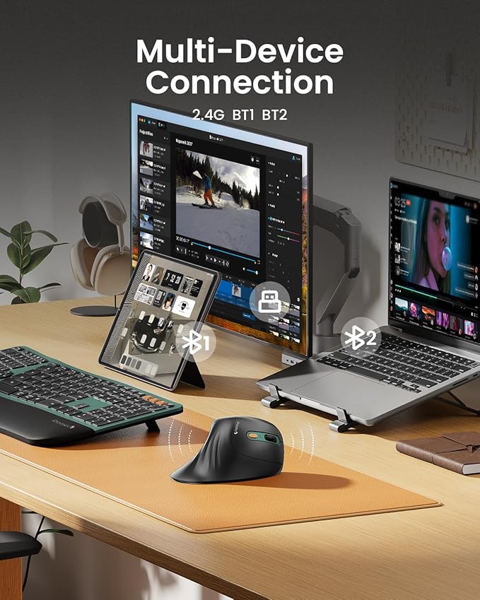 - Connect up to 3 Devices: This ergonomic wireless mouse features dual BT 5.0 and 2.4G USB connectivity modes for simultaneous connection of up to 3 different devices, and is compatible with Windows 8, Windows 10 or higher, Mac OS X 10.12 or higher, and Android 4.3 or higher