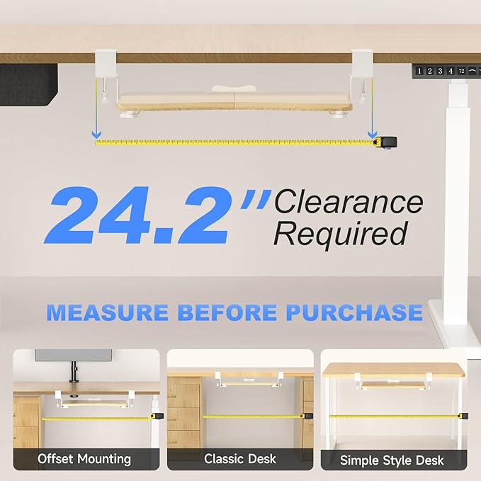 - Universal - This 20" (24.2" including clamps) x 11.8" under-desk keyboard tray holds your small keyboard, mouse, and other small accessories below the desktop to add work space. Please not it does NOT fit if your desk thickness is over 1.57”.