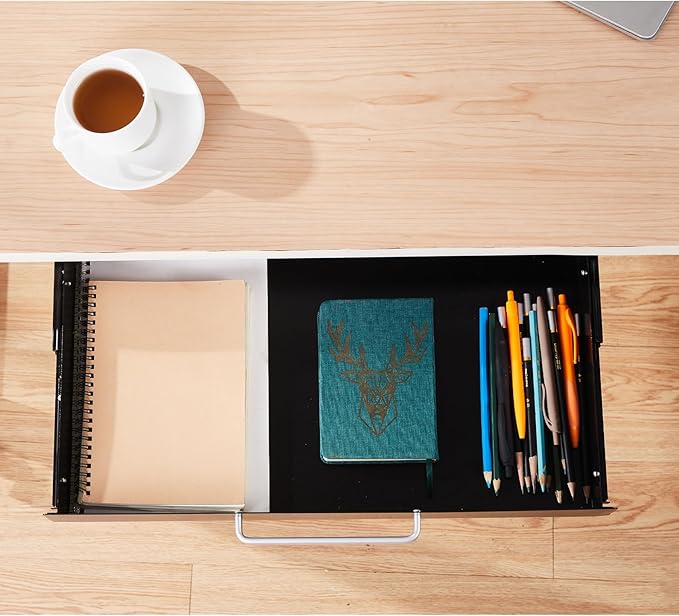 - Work Smoothly: The guide rails are smooth but firm in movement when sliding. The large wide drawer opens more than 90% way, rather than only halfway. The detent of the slide-rail prevents drawer from drifting open due to accidental collision. It's thin in height, hardly noticeable hidden drawer, and will not touch your knees when sitting down.