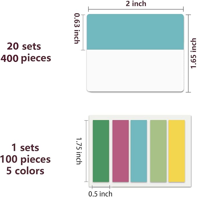 - Sticky Index Tabs: 500 pieces 21 sets in total, 400 pieces 2 inch sticky tabs in 20 sets with 10 different pastle colors,100 pieces 0.5 in tabs in 1sets, 20 pieces each color