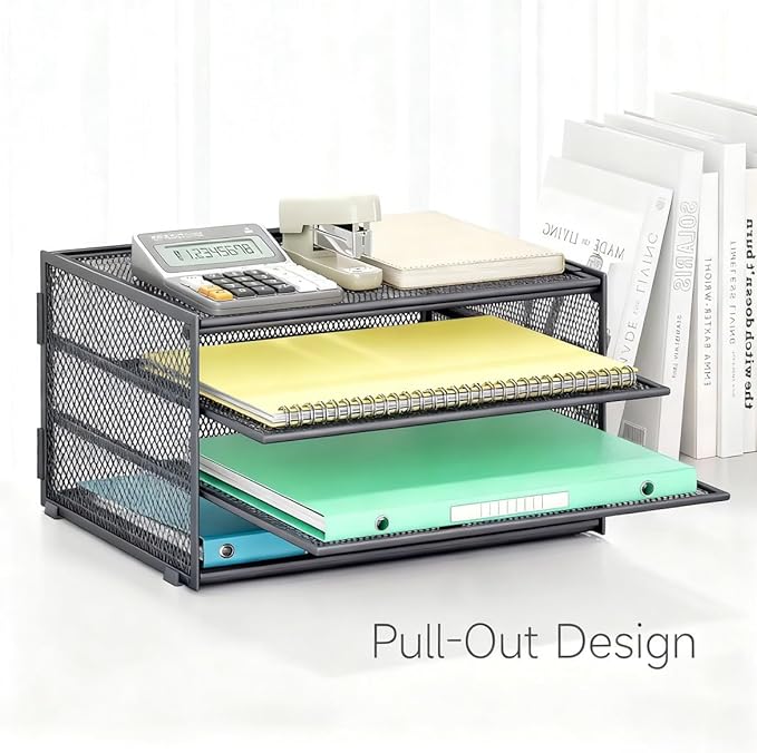 - Desk Paper Organizer Slide Tray Design: Includes 2-piece adjustable slide tray with smooth glide mechanisms for one-handed operation. Features ergonomic accessibility and adjustable dividers to accommodate varying item sizes