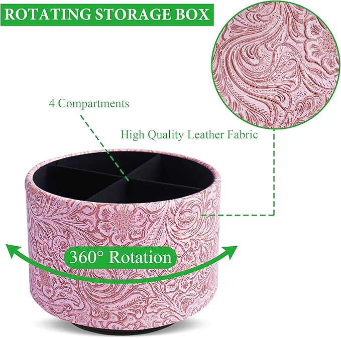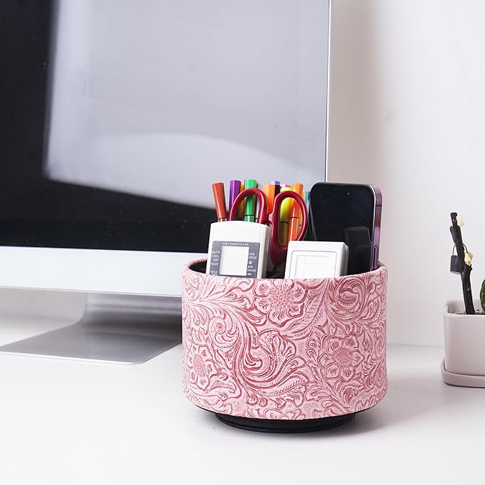lizimandu Round Leather Art Supply Organizer,Remote Control Holder,360 Degree Spinning,Multi-Functional Pencil Holder,4 Compartments Desktop Stationary Organizer(1-Carved Pink)