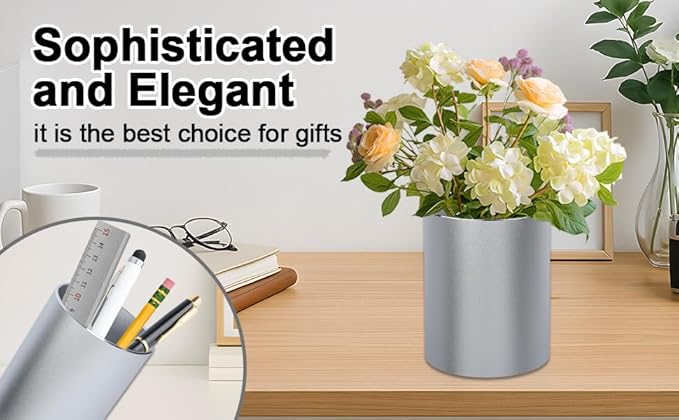 Metal Pen Holder Aluminum Pencil Holder Desktop Organizer Black for Office, School, Home 3.15 x 3.15 x 3.94 Inches-Silver