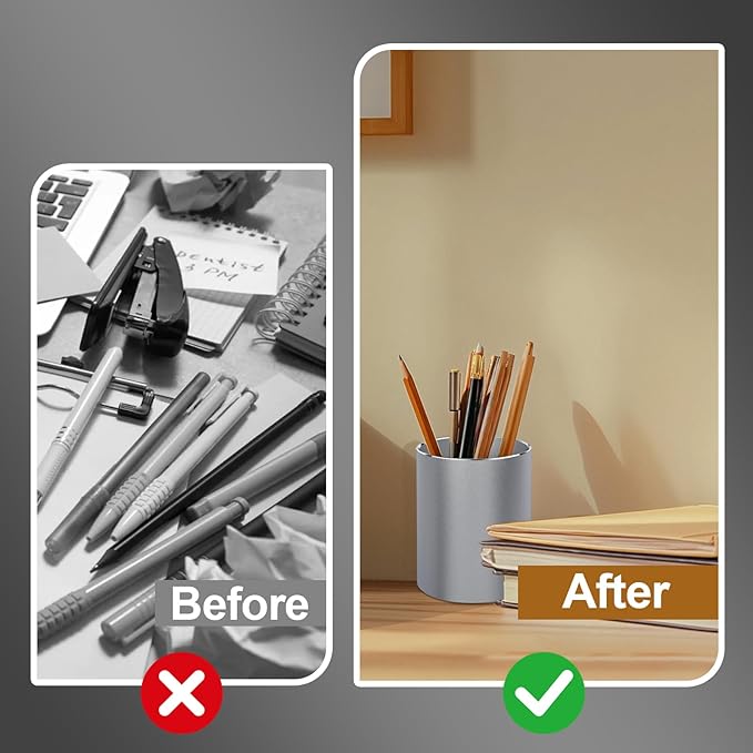 - 【MULTI-FUNCTIONAL PEN CUP TO DECLUTTER ANY DESK】In the classroom, it’s a helpful tool to declutter your desktop such as pens, pencils, highlighters, rulers and other school stationary supplies. At bathroom, you can put toothbrush and toothpaste into the pretty pen holder. At bedroom, you can also organize all kinds of makeup tools on the dressing table. With our solid waterproof pen holder, you can easily declutter any desk!