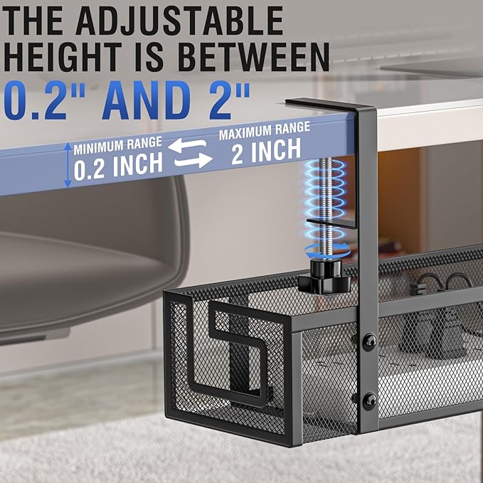 - 【Compatible with Various Desk】 Suitable for flat-edged table tops with a thickness between 0.2 and 2 inches. Please measure your desk's thickness beforehand and verify the dimensions of your power strip to ensure compatibility with this desk organizer.