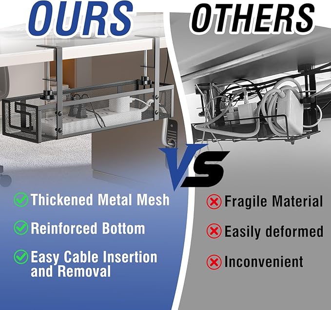 - 【Durable & Heavy-Duty Construction】Made of premium carbon steel, this cable management under desk features a reinforced metal mesh and a sturdy bottom. It supports up to 15lbs and measures 15.75" Lx4.72" Wx3.15" H, ensuring reliable and long-lasting use.
