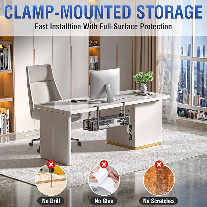 - 【Easy Installation & Desk Protection】 Set up the cable management tray in under 3 minutes with no drilling required. It includes anti-scratch rubber pads to protect your desk surface, unlike other organizers that may damage your furniture.