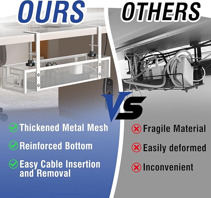 - 【Durable & Heavy-Duty Construction】Made of premium carbon steel, this cable management under desk features a reinforced metal mesh and a sturdy bottom. It supports up to 15lbs and measures 15.75" Lx4.72" Wx3.15" H, ensuring reliable and long-lasting use.