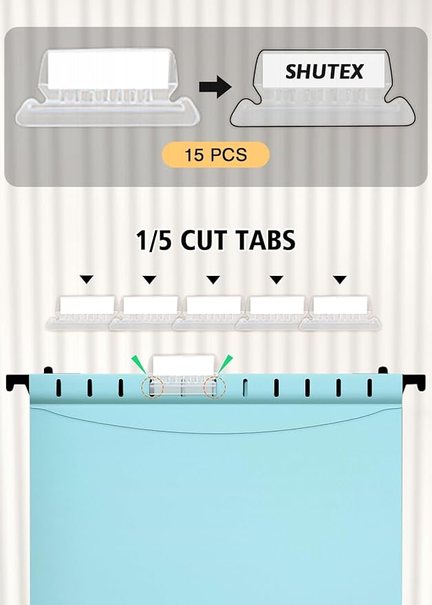 - [INSERT FILE FOLDER TABS] Traditional plastic tabs, all clear, and paper inserts that you write on to identify the folder's contents. The tabs can be placed at various positions along the top of the hanging folder