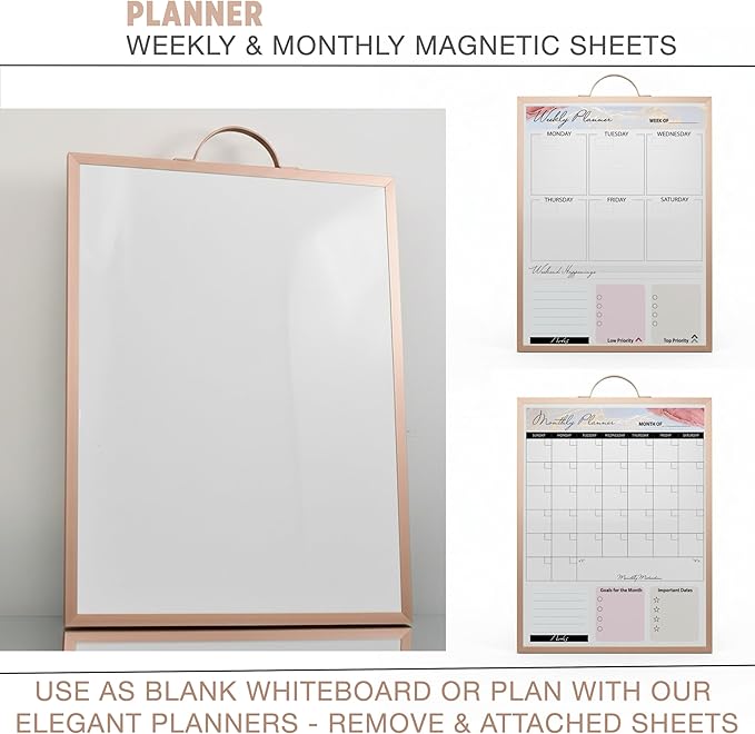 Small Whiteboard 12 x 16 Inch Magnetic Dry Erase Board with Handle | Rose Gold Aluminum Frame | Double-Sided Planner Board with Weekly & Monthly Sheets | 3 Markers, Eraser & 2 Magnets