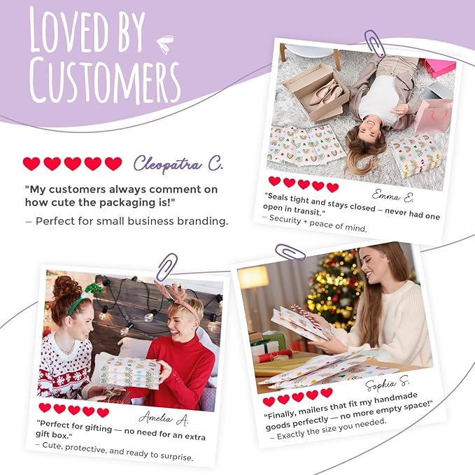 - Eye-Catching Printed Design:Featuring vibrant, full-color prints, these mailers turn every package into a joyful unboxing experience. Perfect for shipping, gifts, or branding!