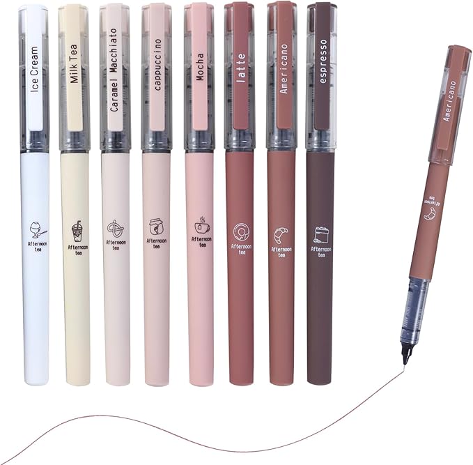 Aesthetic Cute Stick Rollerball Pens, 8pcs Quick Dry Colored Liquid Ink Pens, 0.5mm Fine Point Coffee Gel Pens with Soft Touch Smooth Writing for Journaling Planner School Supplies